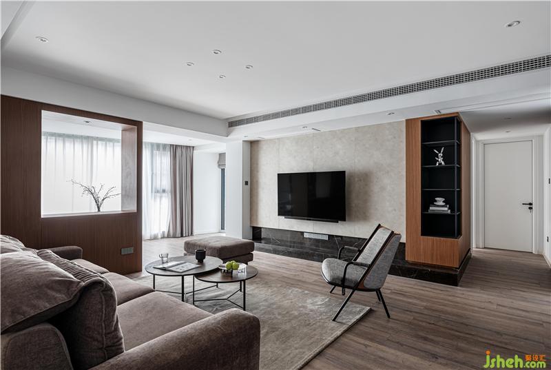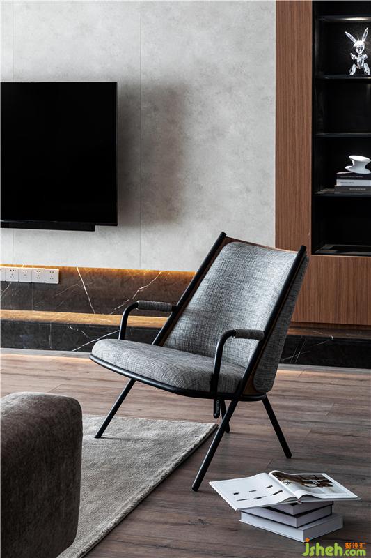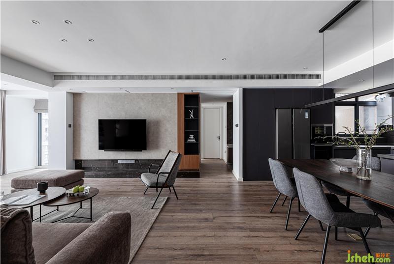 客廳處由于承重墻的限制,并沒有做過(guò)多的改造。設(shè)計(jì)的小心思放在了電視背景墻,室內(nèi)設(shè)計(jì)師選擇使用四種材質(zhì)碰撞,并將背景墻延伸至轉(zhuǎn)角過(guò)道處。同時(shí)背景墻后的兒童房,讓出小部分空間給到過(guò)道,使延伸至過(guò)道的電視背景墻,也擁有了強(qiáng)大的收納功能。