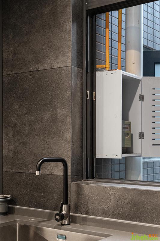 將冰箱內(nèi)入,燃氣表也移至了廚房的窗外,并用PVC保護盒進行保護,使整體看上去更簡潔大方。還將整個廚房的所有管道都隱藏于櫥柜內(nèi)部,由于明黃的天燃氣管在整個空間顯得太過于突兀,于是我們選擇給他點顏色瞧瞧 — 涂黑它。