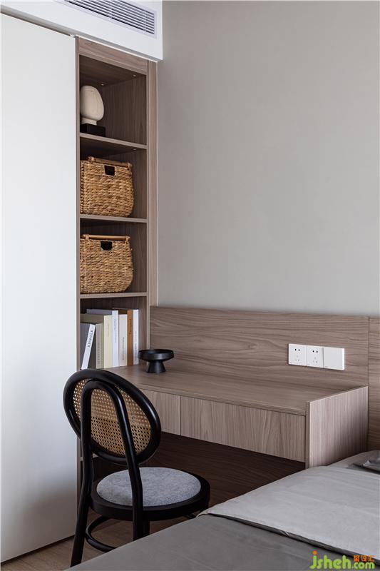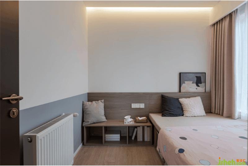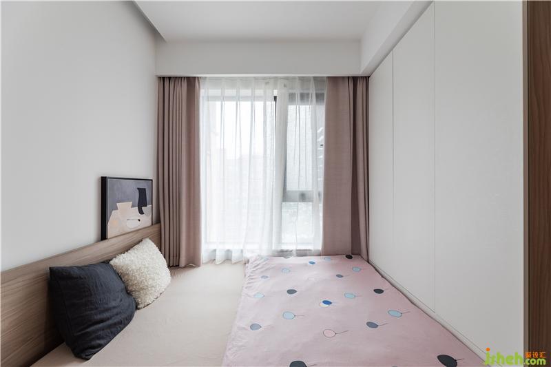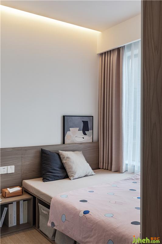 兒童房不大,為了保證有一定的收納空間,以榻榻米+定制柜的形式呈現(xiàn)。由于小舒顏年紀(jì)太小,直到2歲以后才考慮與父母分床睡。所以室內(nèi)設(shè)計(jì)師選擇一組床邊套柜,不需要時收納進(jìn)床邊也不占空間;需要時,格子拉出來變成一排矮凳,L型格子滿足孩子成長中逐漸增加的收納需求。
