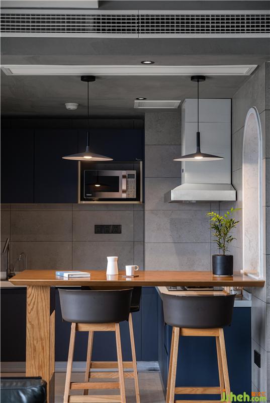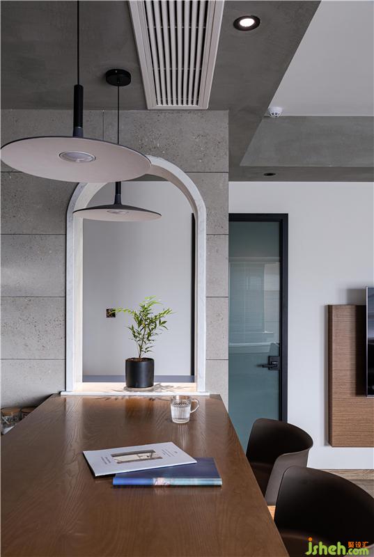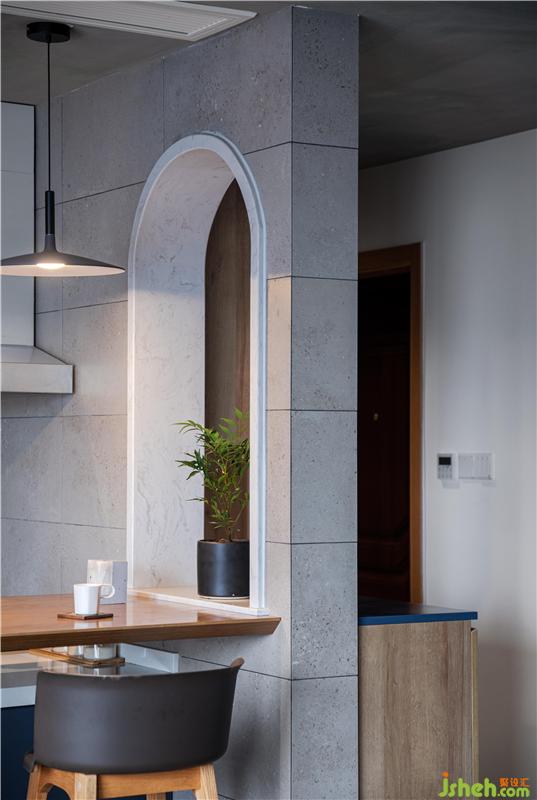在設計玄關的時候故意把這個空間的色調調的比較暗,營造一場與明亮辦公環(huán)境形成反差的歸家氛圍,廚房與玄關的墻體之間利用石材做了鏤空的拱形造型。