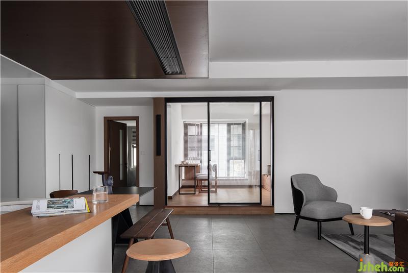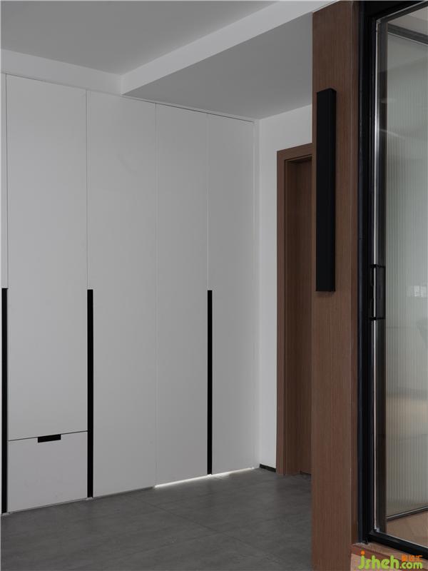 于是我們將書房門洞移位至正對(duì)客廳,拆除部分墻體使用長(zhǎng)虹玻璃與玻璃推拉門將其替代,既是獨(dú)立的空間還能補(bǔ)充客餐廳區(qū)不足的光線。保留書房主要功能,讓屋主后期可以隨心所欲給其填色,慢慢把房子住成家的模樣。