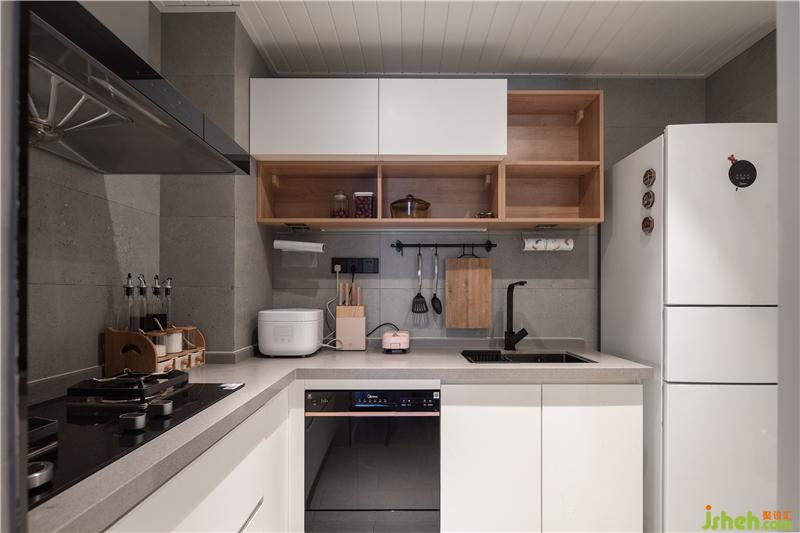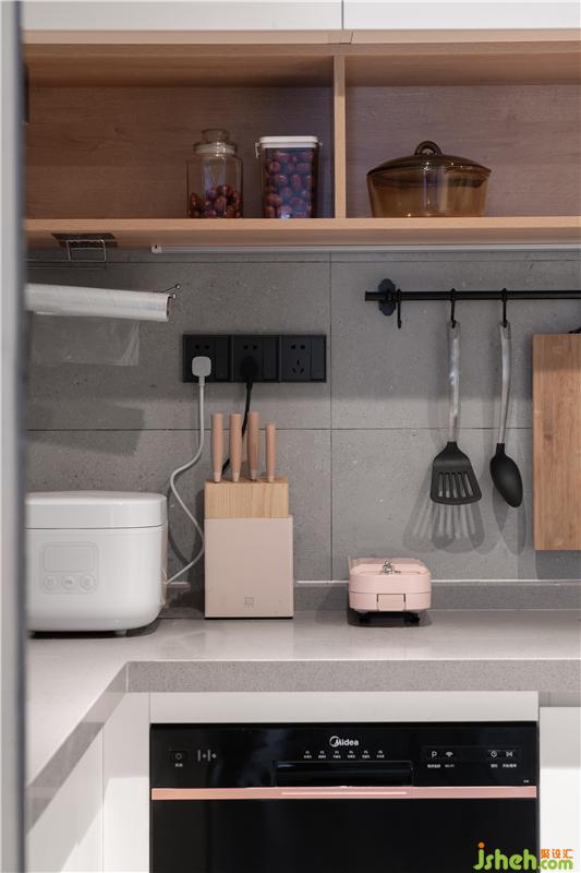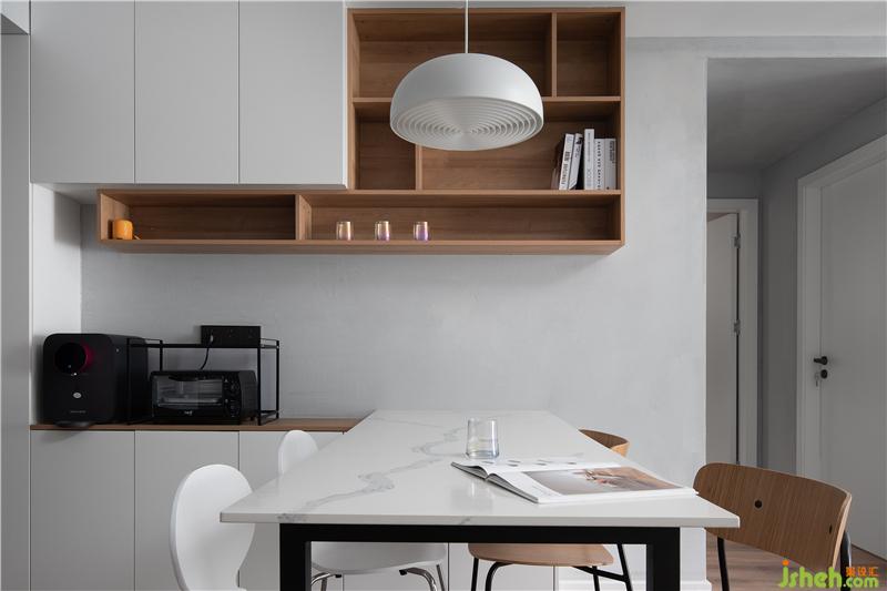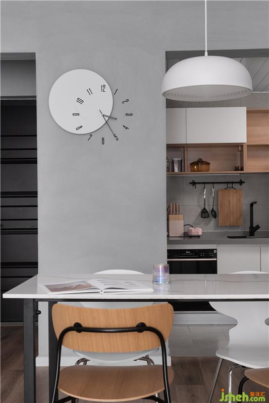 利用玄關(guān)至廚房的轉(zhuǎn)角,將餐廳與廚房進(jìn)了結(jié)合,把餐桌與島臺(tái)放在櫥柜上面,一個(gè)有儀式感與煙火氣的餐廚區(qū)就這樣誕生了。