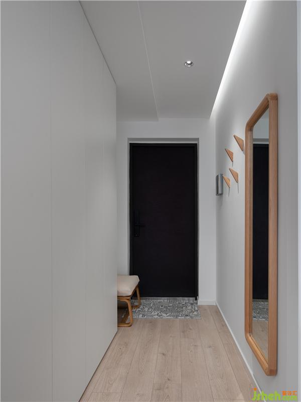 為了保證空間的干凈,整個公共區(qū)域僅用入戶延伸至飄窗臺的墻面做了一組大小不一的收納柜,保證收納合理性。一組換鞋凳+穿衣鏡的搭配,適當(dāng)?shù)狞c綴玄關(guān),為家人的外出和歸來做好最后一道準(zhǔn)備。