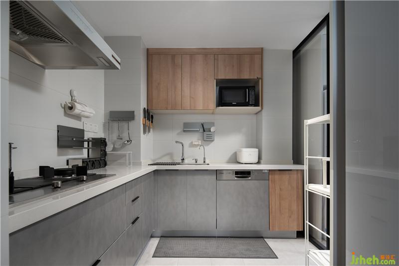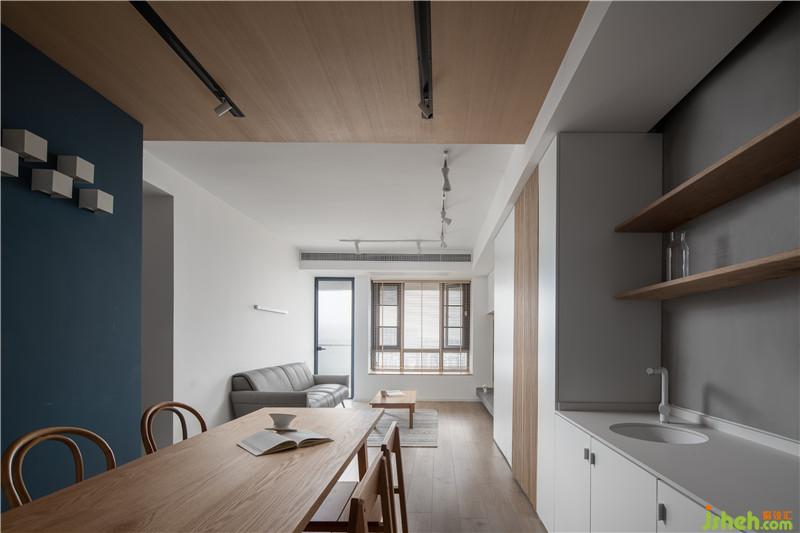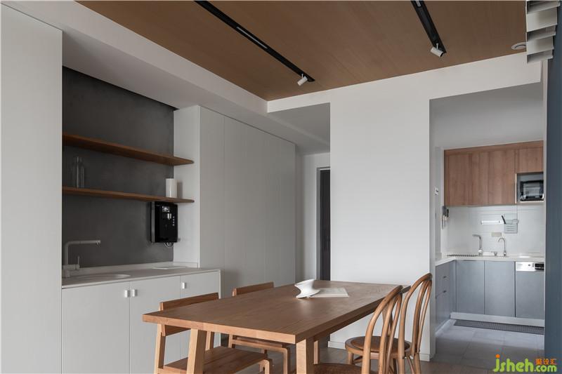 餐廳區(qū)增加西廚功能,屋主們比較喜歡吃零食,所以一組簡約置物架就顯得尤為重要,這個區(qū)域也補充廚房收納空間的不足。