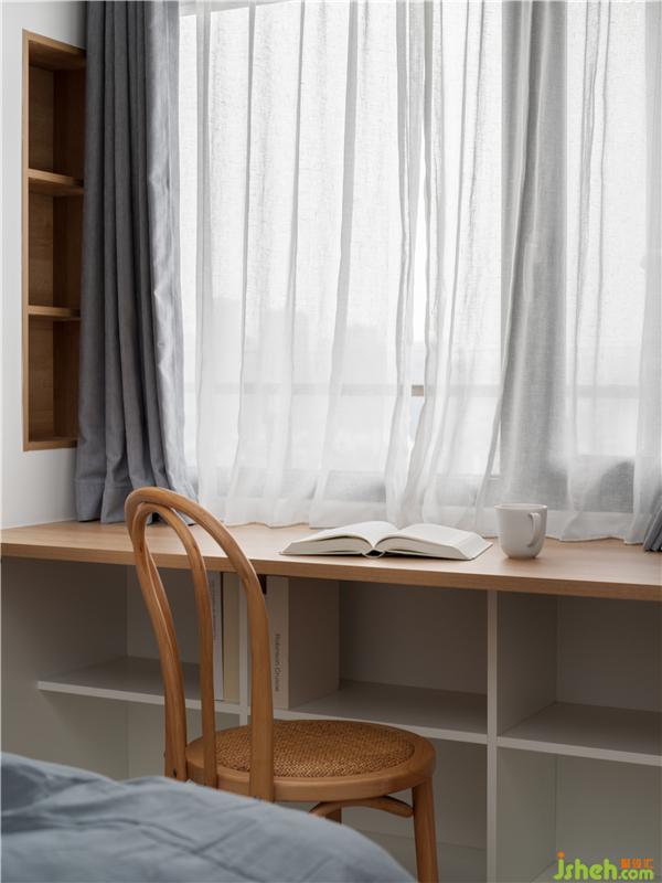 原始主臥空間局促,原方案是將全部陽(yáng)臺(tái)納入主臥,但是物業(yè)部門(mén)無(wú)法通過(guò)此方案,所以僅向陽(yáng)臺(tái)借用了一部分空間形成當(dāng)下的書(shū)桌。