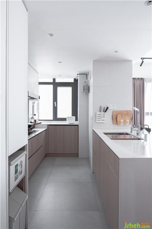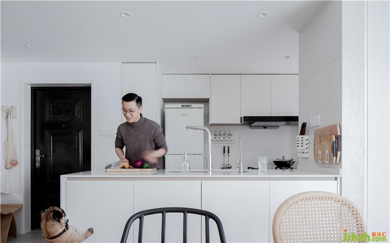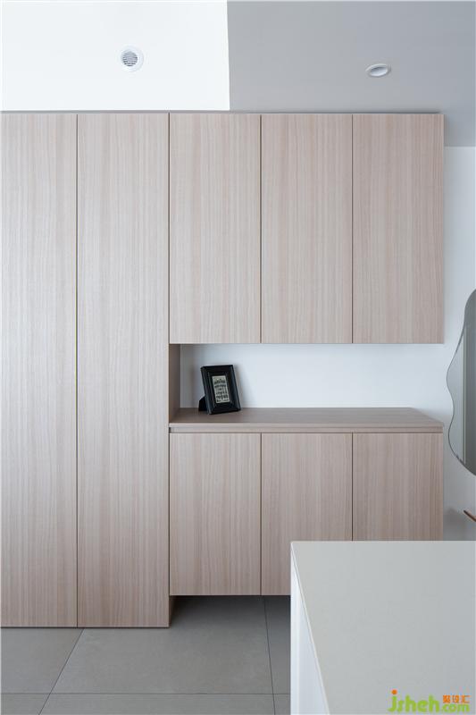 廚房是典型的非隱私封閉空間,開放式設(shè)計(jì)也為了讓家人更好的交互。櫥柜水盆柜為雙面設(shè)計(jì),背面的薄柜存放水杯、水瓶,使用時(shí)取出杯子,起身稍加沖洗,即可取用RO純水。