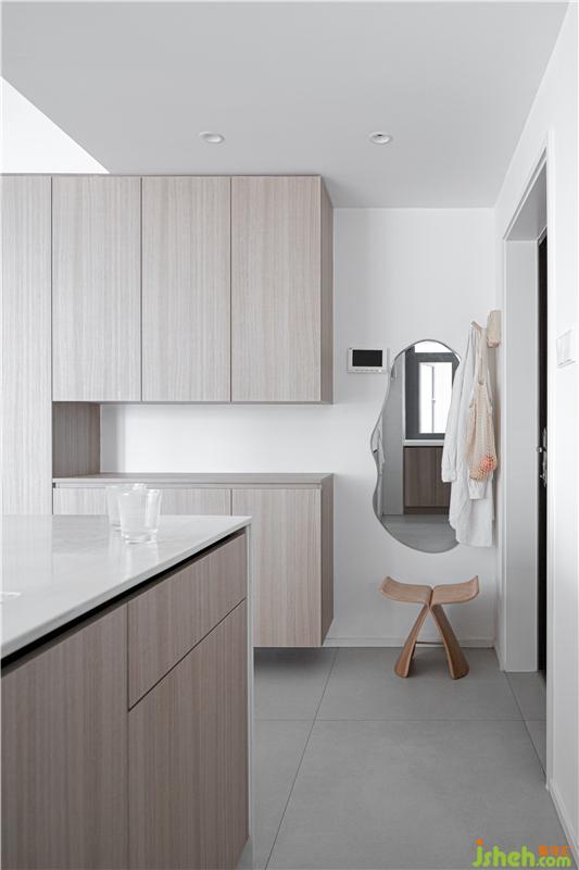 多功能集成柜與入戶門之間留出的空間,安裝了一鳴外婆心心念念的全身鏡,柳宗理的蝴蝶凳作為換鞋凳,可以讓年邁的老人很安心的坐著換鞋。