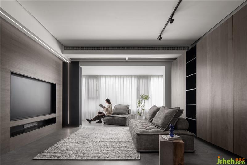 整個(gè)公共區(qū)域的收納在客廳與衣帽間重組后成為其歸宿,休閑陽臺(tái)作為紐帶聯(lián)系起客廳與衣帽間,為屋主提供便捷的即洗即晾的一體化服務(wù)。頂部嵌入式條形燈帶從入戶一直延伸至陽臺(tái),與嵌入式踢腳線燈帶首尾呼應(yīng),不止是回家的“引路人”。當(dāng)屋主放映影片時(shí),光影配合影片為屋主營造私人影院氛圍感。