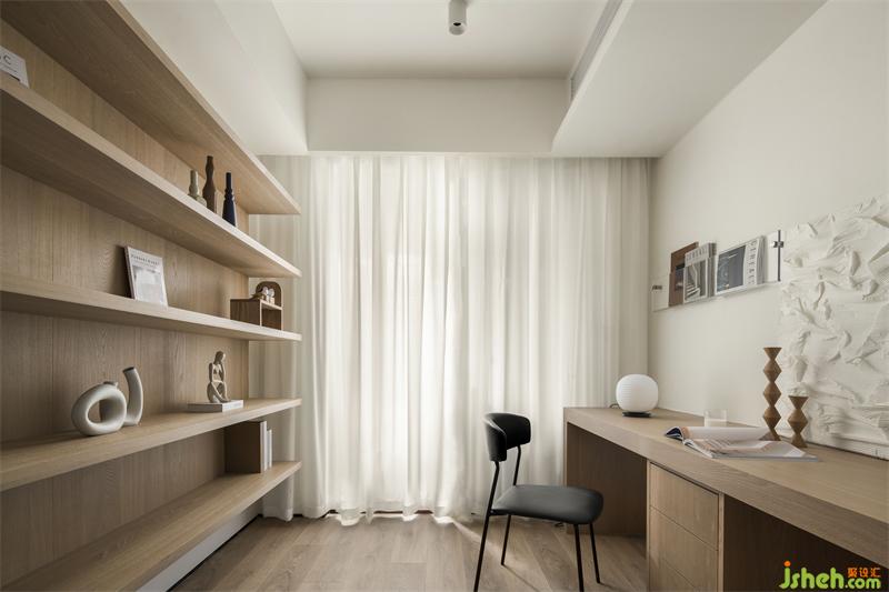 通過書房陽臺和走廊的玻璃推拉門保證廚房的采光,同樣以白墻、玻璃、原木3種元素保證基調(diào)的統(tǒng)一。開放式置物架既是書籍的歸處恰好也變成了貓咪們喜愛活動的空間。