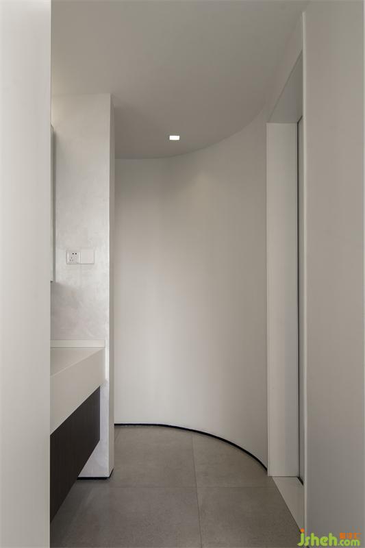 走廊原本外露的水管無法移位,以弧形墻面造型將計(jì)就計(jì)的將其包裹其中。