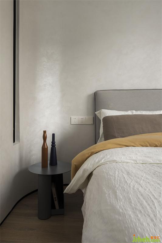 主臥自然采光較強(qiáng),搭配灰色棉麻床品降低光線帶來的炙熱感。