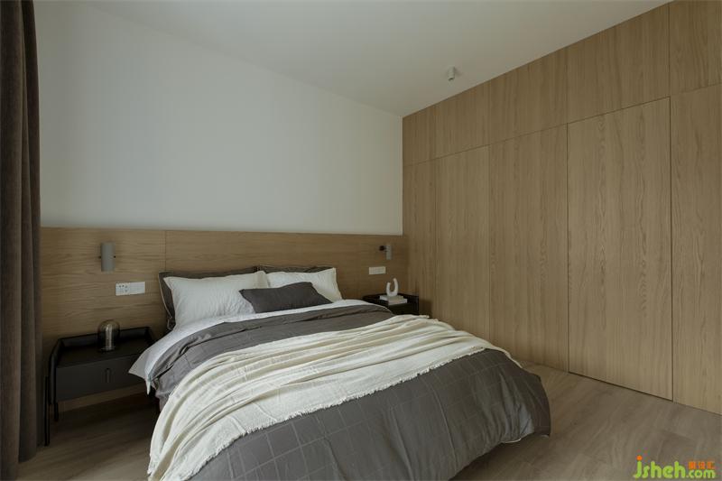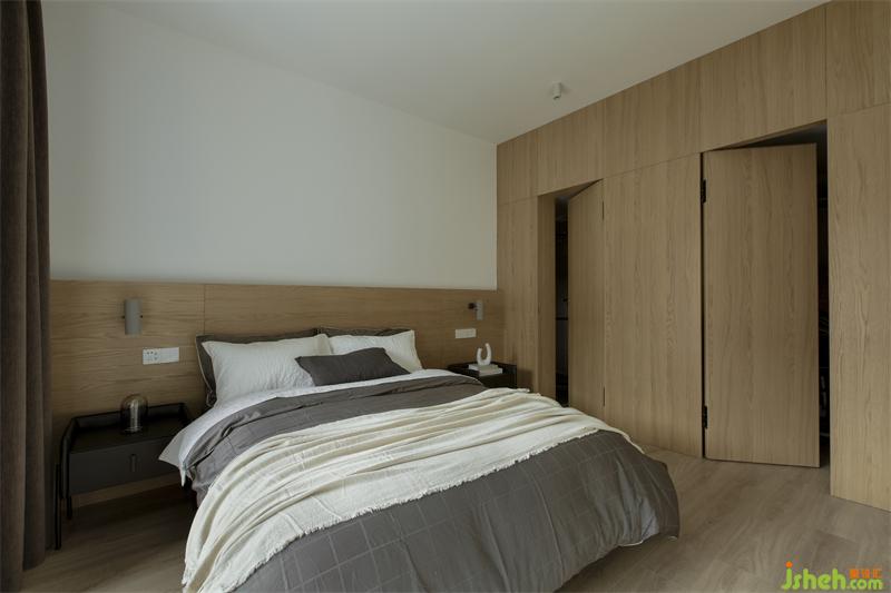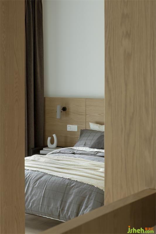 主臥原本需要通過一條悠黑狹長通道進入,移門后,便省出了一間獨立衣帽間。主衛(wèi)生間和衣帽間的進門的墻體做了隱形門處理,避免主衛(wèi)門對床的尷尬。