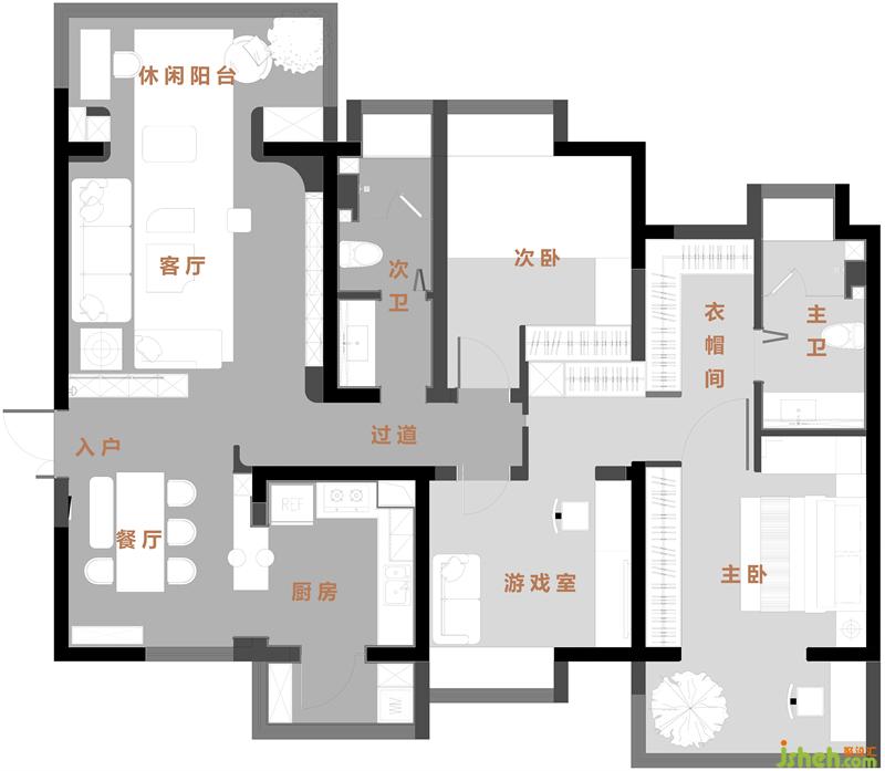 ? 主臥室布局由游戲式書(shū)房+儲(chǔ)物過(guò)道+衣帽間+衛(wèi)生間+臥室+休閑陽(yáng)臺(tái)組成,而原始主臥無(wú)法容納下以上所有空間的問(wèn)題,同時(shí)主衛(wèi)的大小也無(wú)法滿足功能的分離設(shè)計(jì)