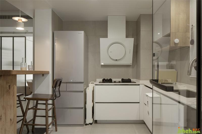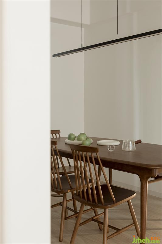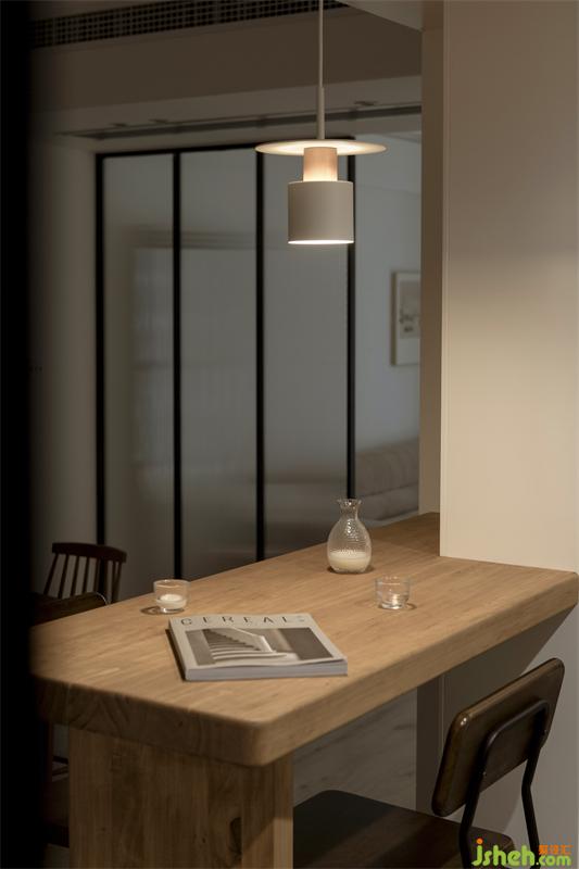 餐廳與廚房的開(kāi)放式設(shè)計(jì),由木質(zhì)吧臺(tái)進(jìn)行過(guò)渡與融合,微弱柔和的吧臺(tái)燈恰好為屋主們?cè)鎏砹艘环萆顑x式上的氛圍氣。