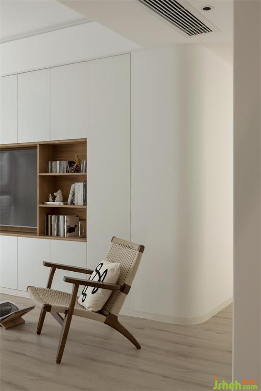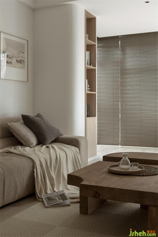利用延長(zhǎng)視覺(jué)+弧形的方式去改善剪力墻帶來(lái)的擁堵感,將客廳與陽(yáng)臺(tái)形成一個(gè)整體。