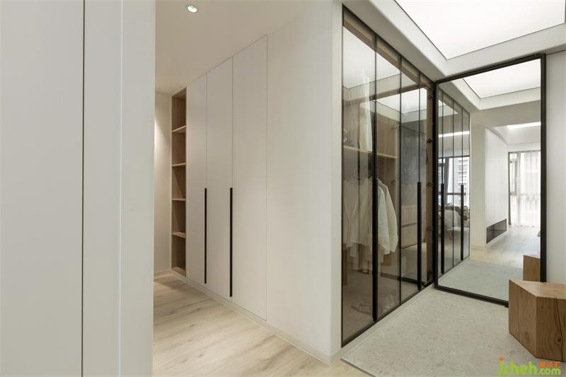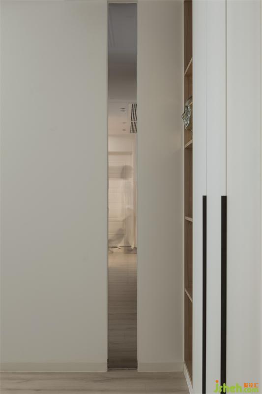 衣帽間與主臥室的連接同樣采用地彈簧門的設(shè)計(jì),定制木門表層處理則是設(shè)計(jì)師親手完成的藝術(shù)漆面,門不止遮擋視線的作用,合理利用讓它變成一幅與空間高度融合的畫 。