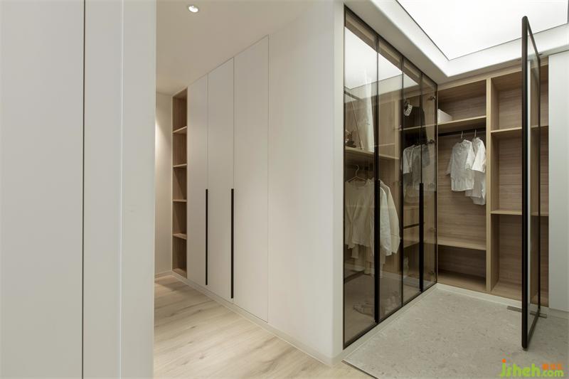 衣帽間采用了軟膜天花的設(shè)計(jì)更好的模擬天光,同時(shí)加入地彈簧的旋轉(zhuǎn)鏡,從視覺上拓展空間的寬敞感也為屋主換衣時(shí)提供補(bǔ)光效果;