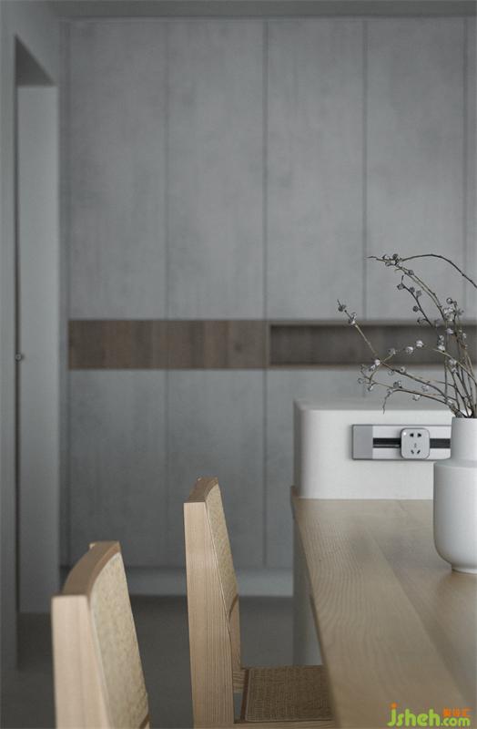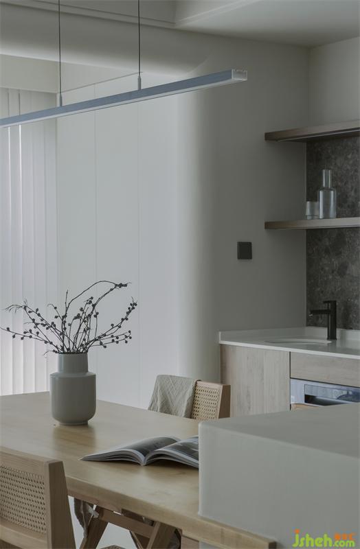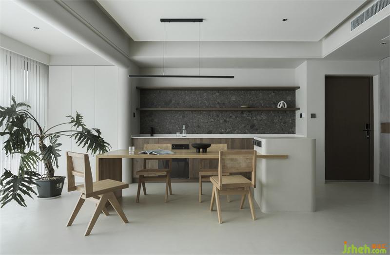 開(kāi)發(fā)商提供的玄關(guān)柜設(shè)計(jì)不合理且不實(shí)用,選擇拆除重做后的柜體風(fēng)格更簡(jiǎn)潔統(tǒng)一。餐廳由一整面墻的收納,與帶島臺(tái)的實(shí)木餐桌組成。