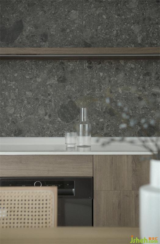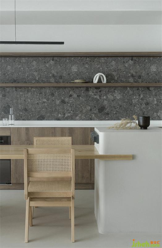 墻面和現(xiàn)場(chǎng)制作的島臺(tái)都選擇使用這種材料,來(lái)實(shí)現(xiàn)我們想要在公共空間表達(dá)的干凈與侘寂。
