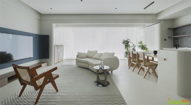 成都家居設(shè)計(jì),拆除客廳與陽(yáng)臺(tái)隔斷,整個(gè)客廳僅靠陽(yáng)臺(tái)的采光便能滿足自然光的補(bǔ)充。地面則考慮使用微水泥掩蓋原有的客廳瓷磚,讓空間更加純粹。