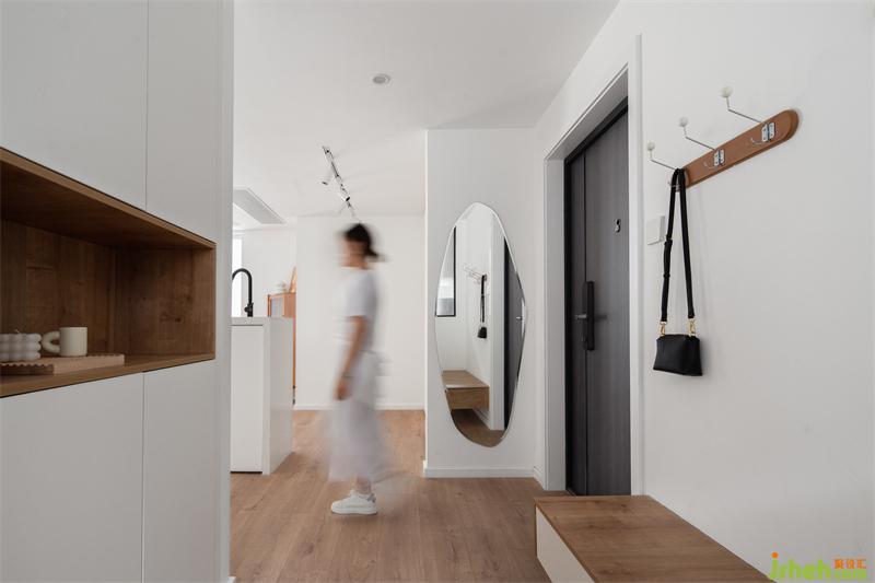 左右兩側(cè)分別以一組白色玄關(guān)柜+一組雜物柜滿足玄關(guān)區(qū)域與生活陽臺區(qū)域的收納。