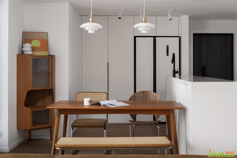 轉(zhuǎn)角處,搭配一個多功能復(fù)古異形柜,材質(zhì)呈現(xiàn)與餐桌相仿。木材會隨時間的推移變得越來越焦糖色,帶來的不僅是溫潤舒適感,還能給家里增添一絲VINTAGE的氣質(zhì)。