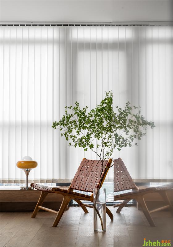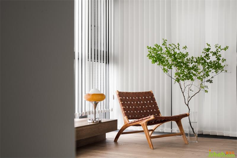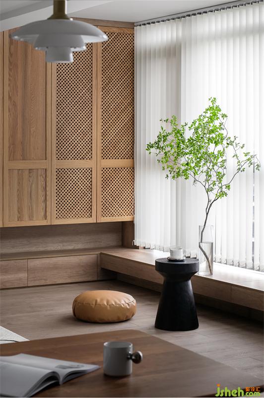 陽臺裝修設(shè)計了一組收納柜體,補(bǔ)充了客廳區(qū)域儲物空間。藤編的元素加入,讓實木的柜門丟掉了沉悶。自然=舒適,鮮切吊鐘賦予這個家更多的生命力。
