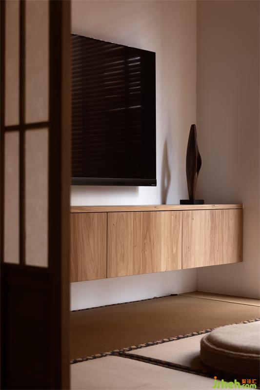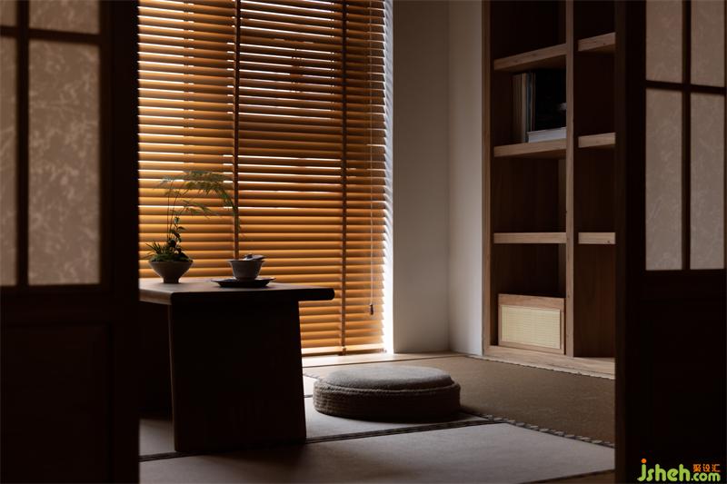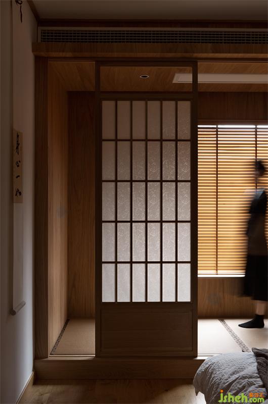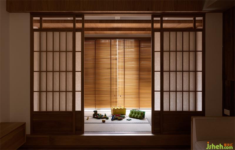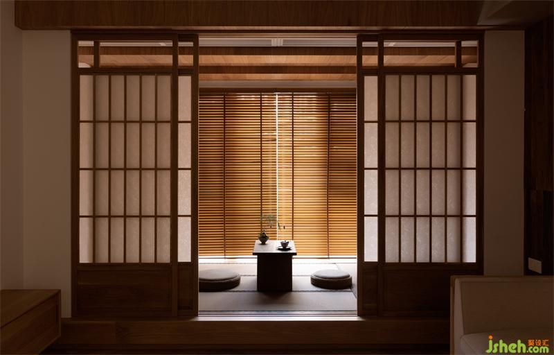 將原休閑陽臺塑造成多功能室,傳統(tǒng)古樸的推拉門運(yùn)用了傳統(tǒng)日式榻榻米推拉門的做法,以樟木和障子紙形成了多功能室與客廳的隔斷。