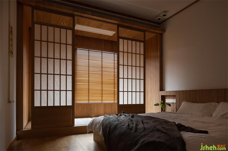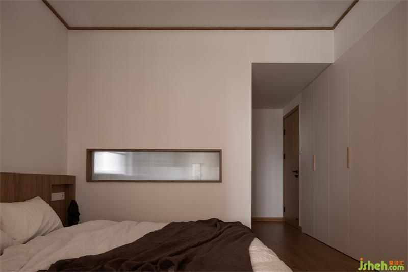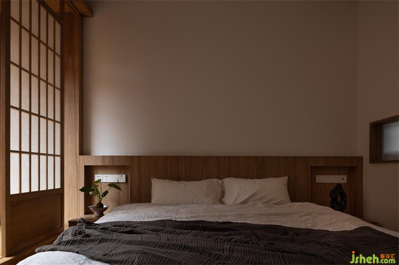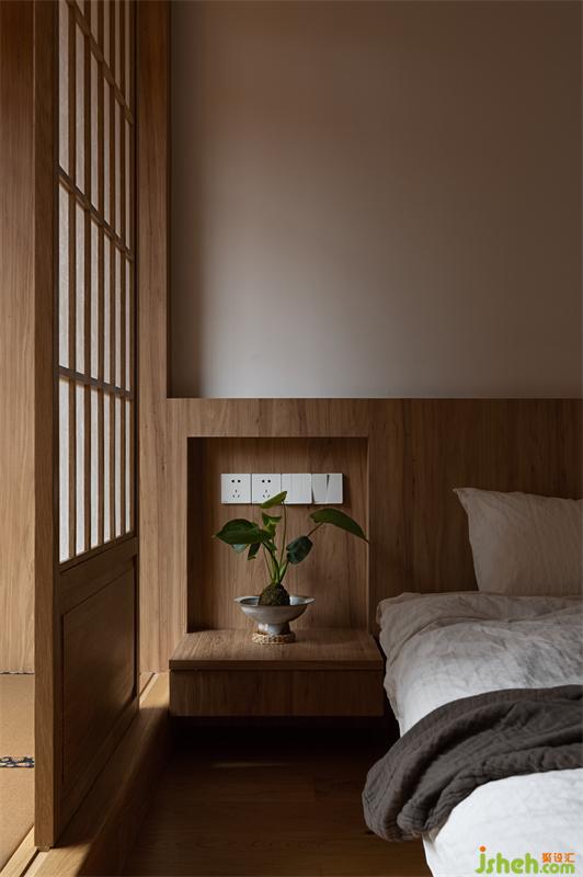 主臥的床也是實(shí)木定制,榆木的木質(zhì)感強(qiáng),木紋與顏色都恰到好處,不會過深也不會過淺。床沿的高度與榻榻米陽臺齊平,不會過于突兀。