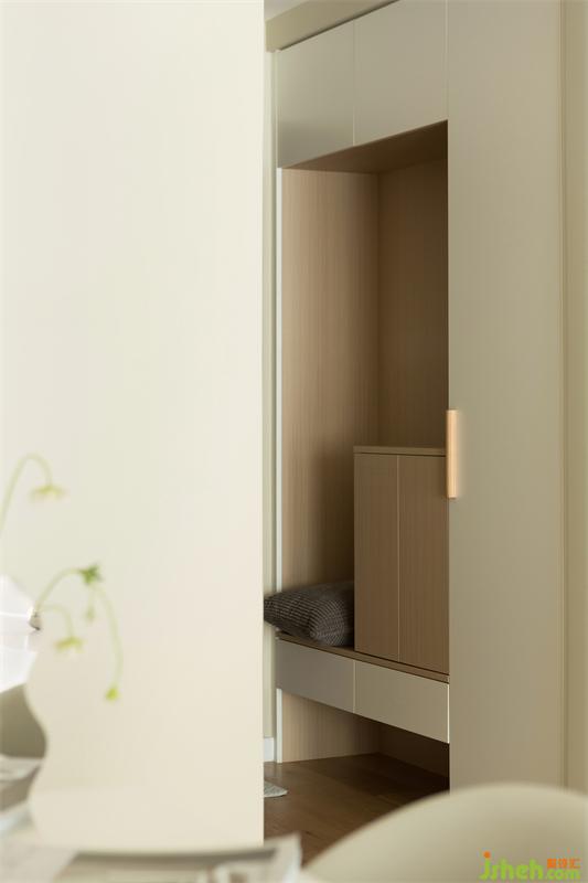 拆除入戶造型復(fù)雜的玄關(guān)柜體,替換為造型更干凈整潔的柜門(mén),在功能性上增添帶有換鞋凳功能的收納柜。