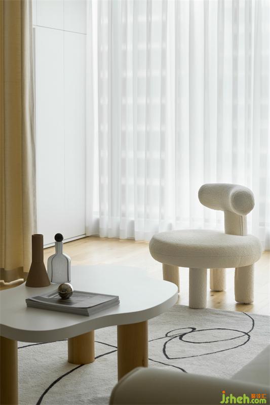 手工抽象油畫(huà)點(diǎn)綴著硬朗的墻面,柔和的筆觸與抽象線條的地毯相呼應(yīng)。米色沙發(fā)的絲絨質(zhì)感搭配白色單人椅相互呼應(yīng)。