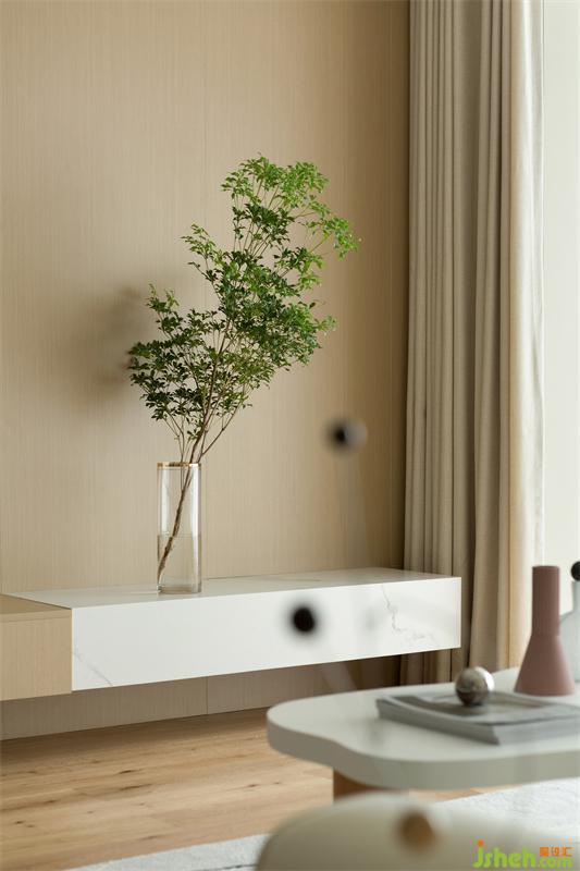 客廳的電視背景墻區(qū)為了后續(xù)與配套的激光電視放映儀器更契合,而專門(mén)現(xiàn)場(chǎng)打造的一個(gè)包含著350*700MM抽屜的地臺(tái)區(qū)域,兩側(cè)由巖板包裹著地臺(tái)表面。