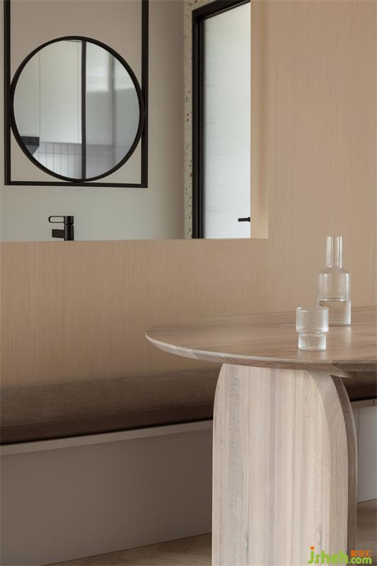 卡座設(shè)計(jì)使得餐廳和盥洗區(qū)得到了最大化利用,與橢圓餐桌搭配,減少直角桌對小朋友的磕碰,同時(shí)可以提高入座率??ㄗ路絻?chǔ)物柜用于收納餐廳物品收納,保持空間整潔。借用生活陽臺(tái)部分區(qū)域做儲(chǔ)物間,絲絨門簾做遮擋,日常的餐廳物品收納其中。