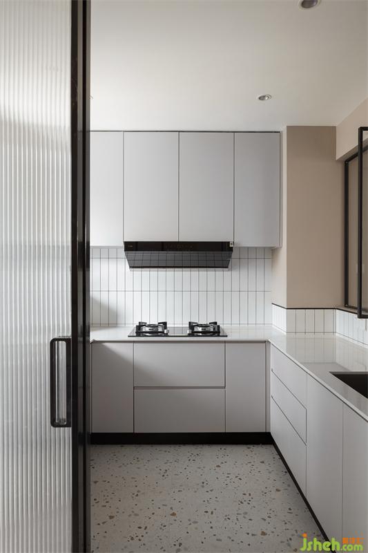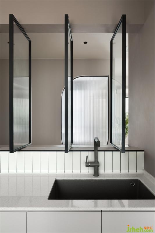 廚房乳膠漆與白色小方磚的極窄收口黑色線條自窗臺(tái)區(qū)域貫通而來,分隔墻面色彩,延伸視覺體驗(yàn)。