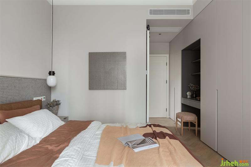 利用主臥的整面墻體去實(shí)現(xiàn)收納與梳妝臺(tái)功能。長明格柜和抽屜嵌入其中,作為梳妝用品收納。啞光黑面板區(qū)別于兩側(cè)的收納柜,強(qiáng)調(diào)功能重點(diǎn),消除單調(diào)感,聚焦視覺中心。