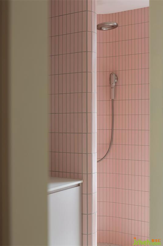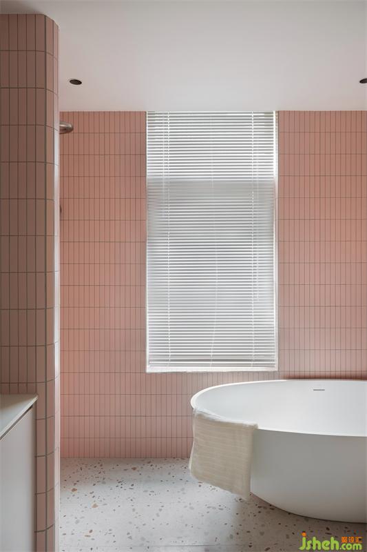 主衛(wèi)作為私密的空間,我們選擇了更大膽的配色。大面積鋪貼猛男都愛的粉色小方磚,同時(shí)選擇在地面區(qū)域鋪貼水磨石方磚中和粉色的甜。就如同草莓甜筒被人喜愛,原因不止粉色的外表,還有一層包裹著的冰激凌的脆皮中和口感,刺激味蕾。
