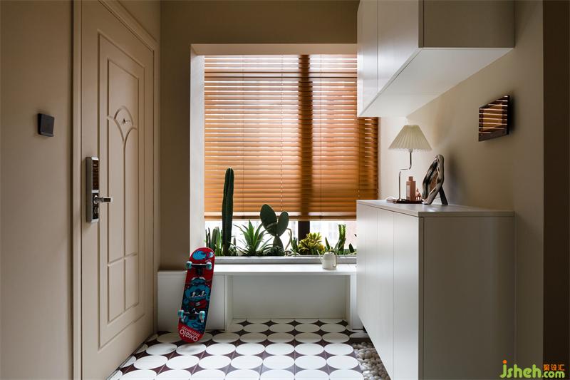 一進(jìn)入玄關(guān)區(qū)域,映入眼簾的便是地面的復(fù)古花磚,與天然的鵝卵石裝飾。為了解決入戶的收納,除了設(shè)置了一組玄關(guān)柜作為收納,同時(shí)靠窗的區(qū)域考慮了具備收納功能的換鞋凳。