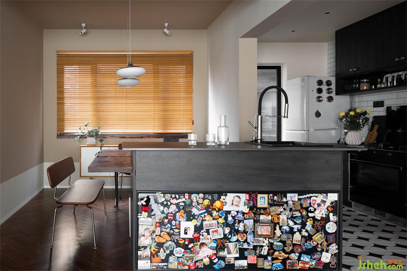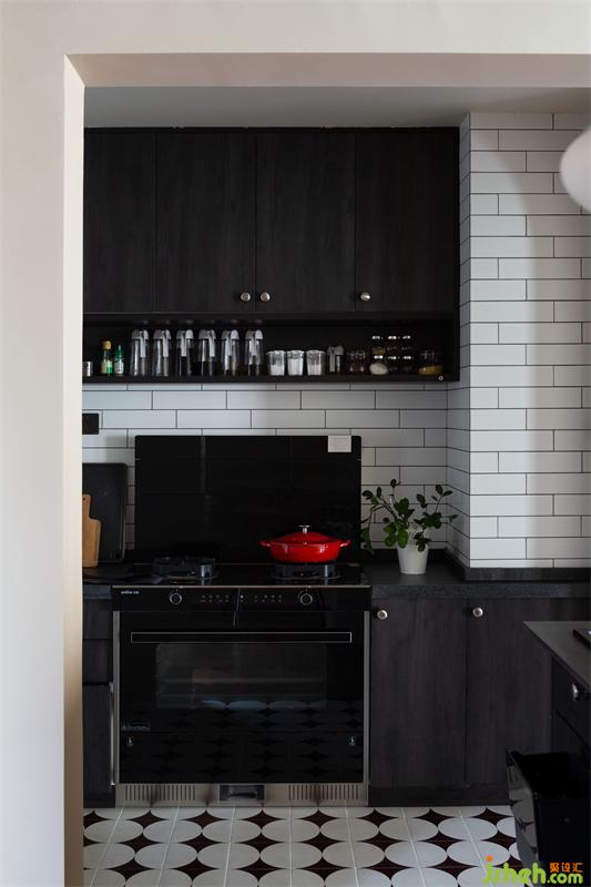 廚房區(qū)域選擇了深色的櫥柜,女主人擺放上悉心挑選的炊具后,色彩的碰撞呈現(xiàn)出復(fù)古的味道。