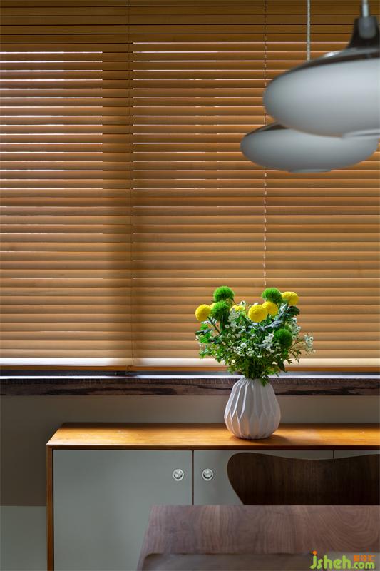 屋主入住后,栽種了許多綠植,她說:“我的家里不允許出現(xiàn)一盆假花?!庇谑牵烊坏臒釒в炅直沩樌沓烧抡紦?jù)入戶臨窗一側(cè),吸納著自百葉窗透過的暖陽(yáng)。隱約光影映照出仙人掌的形狀打進(jìn)屋里,美與生活氣息,在此刻達(dá)到平衡。