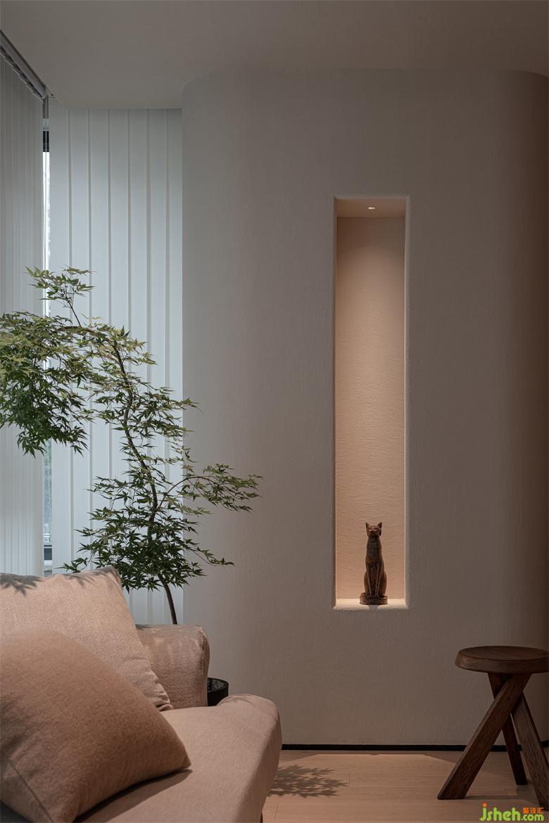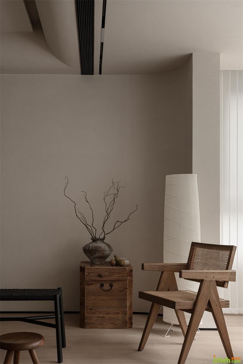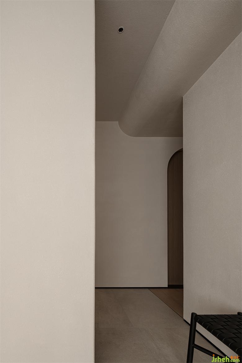 「社交」區(qū)域,走廊的陰暗處,讓人產生無限的遐想。這是步入另一個區(qū)域的入口,成都家裝設計頂面依舊采用弧度造型,柔化了房屋頂面高低的突兀感。