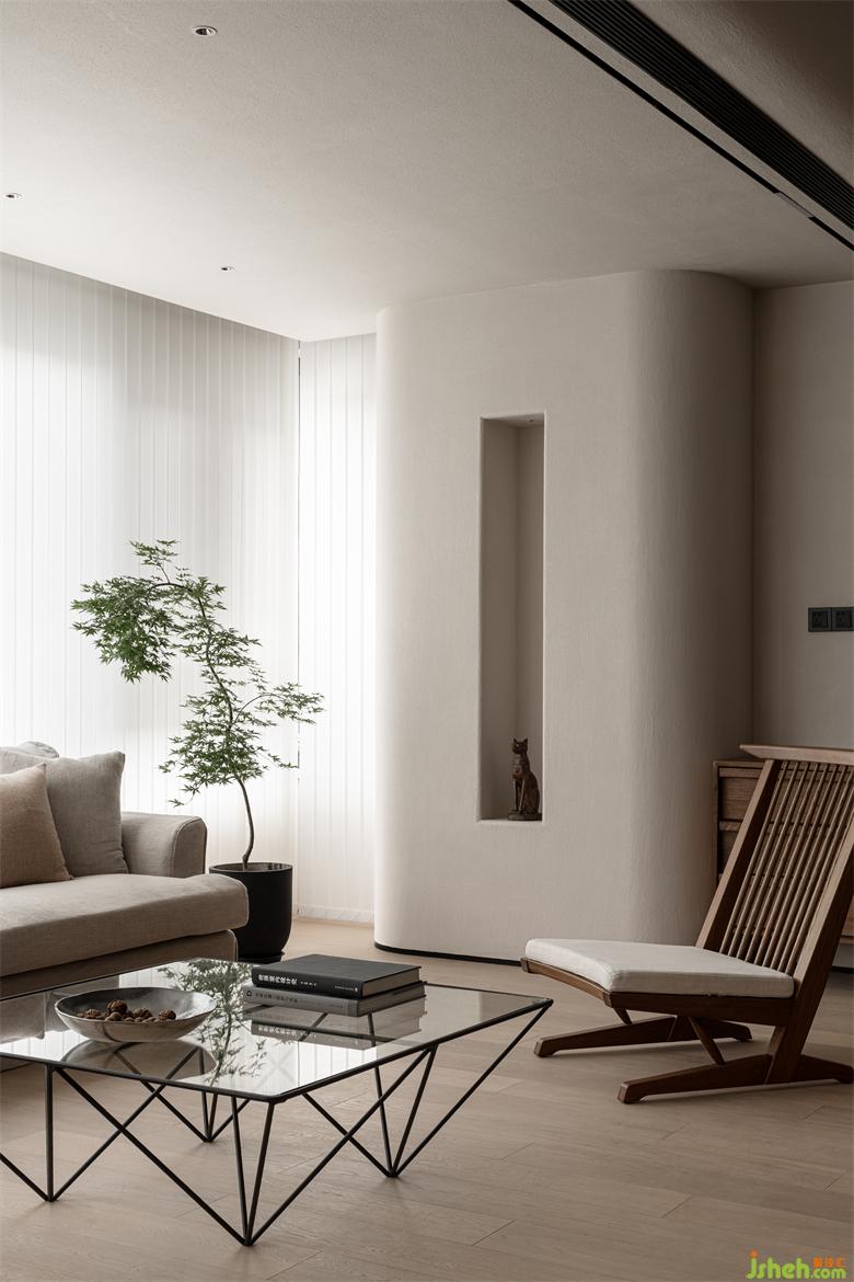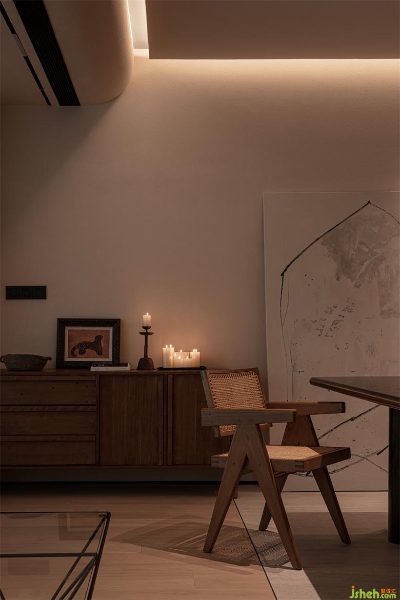 白日里素雅樸實的客廳一角,不顯山不露水,靜靜等待夜幕降臨時的升華。成都家裝設計在特意設計的燈光烘托下,光源襯托出絕妙的儀式感,光賦予了空間屬性,神秘和溫馨。