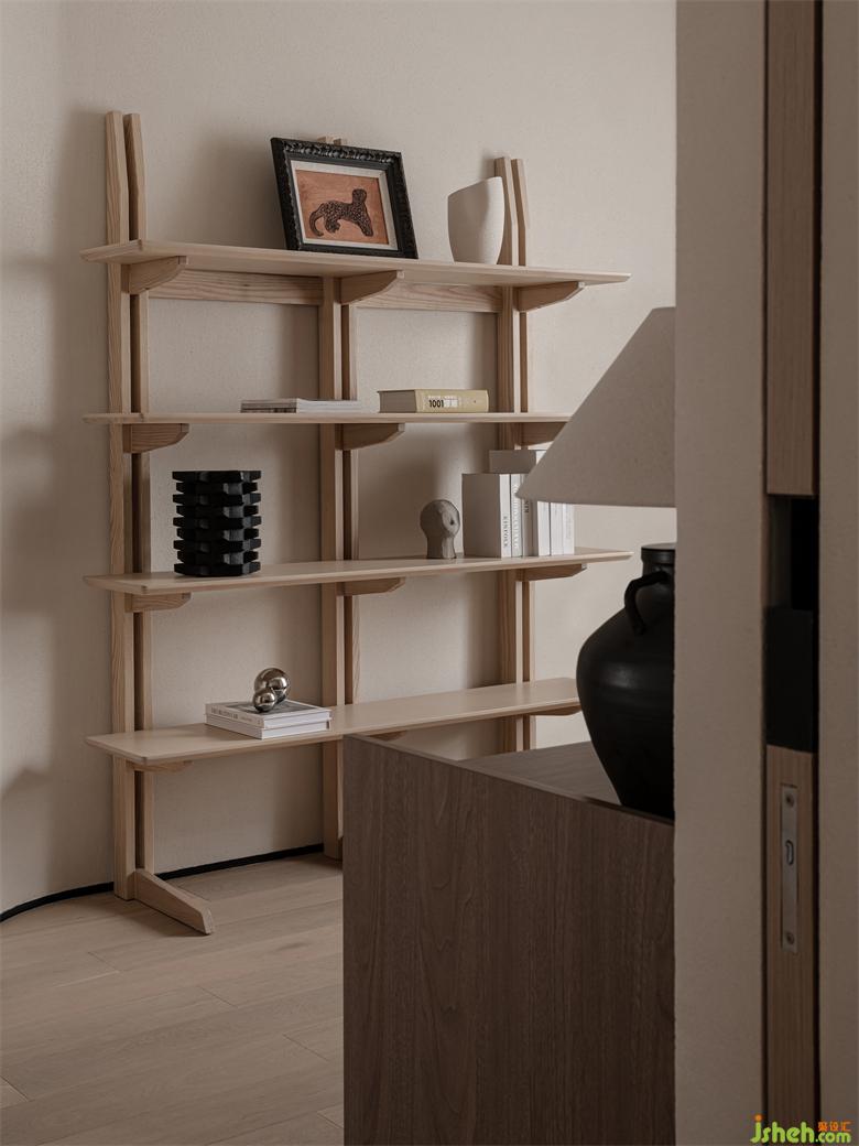 沒有大體量的柜體設(shè)計(jì),讓空間還原到舒適的尺度。書桌靠臥室極近,就算屋主專注地查閱資料到深夜,起身只需幾步,就能到達(dá)自己的睡眠空間。