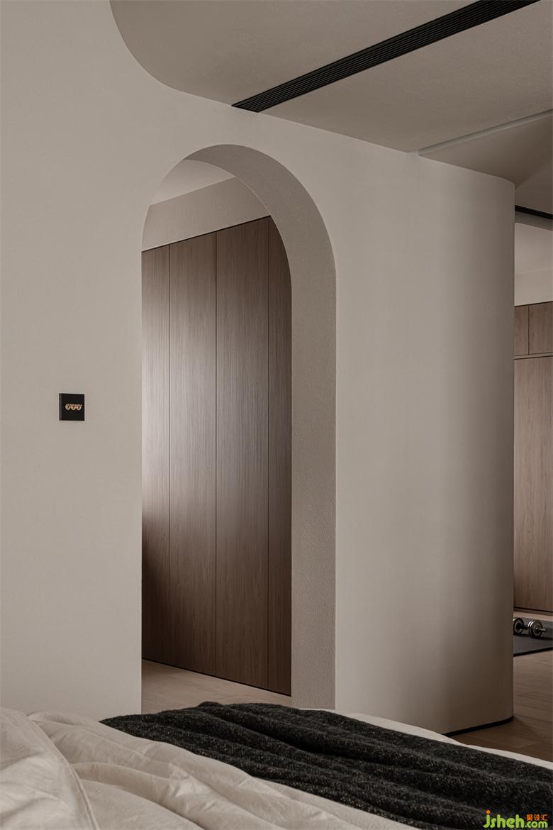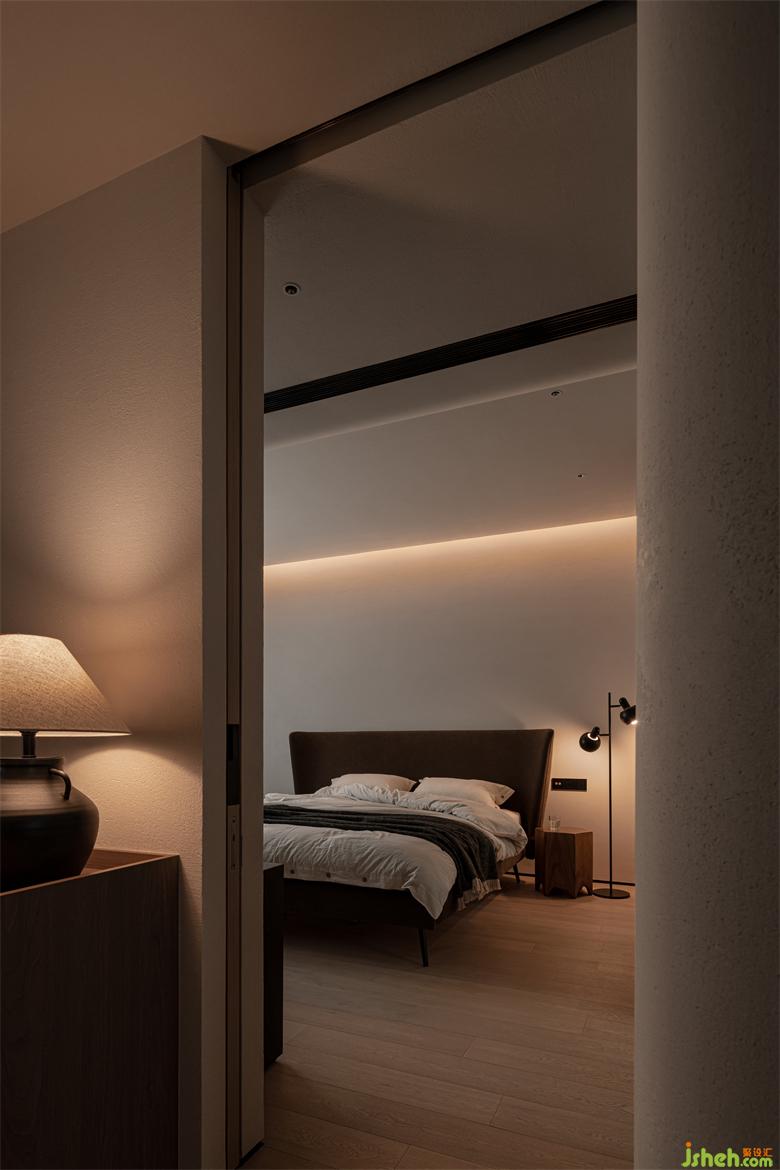 主臥延續(xù)整體空間設(shè)計的自然樸素質(zhì)感,成都家裝設(shè)計穿過走廊與公共區(qū)域連通,跨過一道道門洞,讓生活的儀式氛圍劇增。
