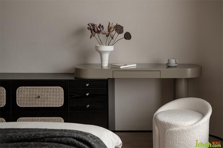應(yīng)對屋主的梳妝和儲物需求,成都家裝設(shè)計在床尾特別設(shè)計了斗柜+梳妝臺的整體成品家具。