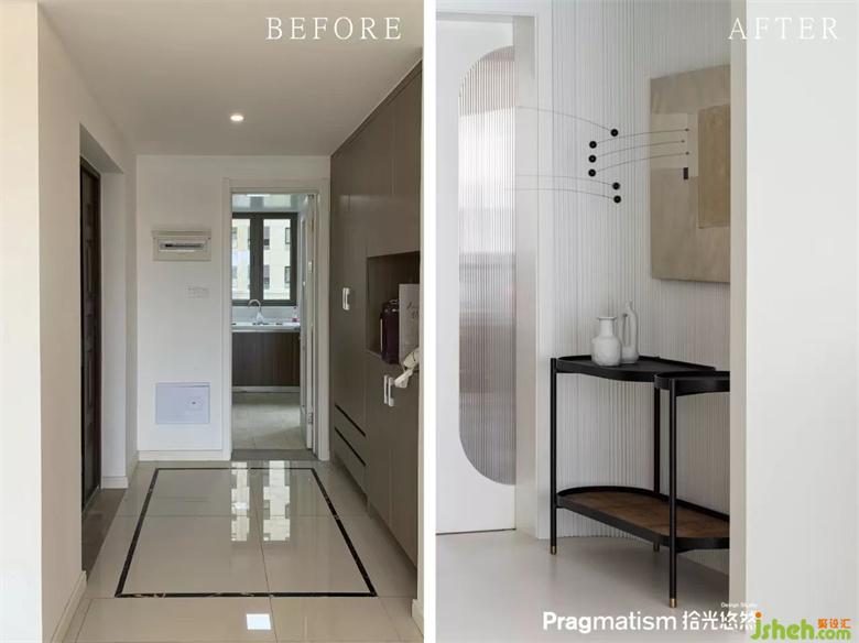 入戶左側是廚房的位置,原本的推拉門改為藝術玻璃移門,家裝設計保證整個公區(qū)空間的色系統(tǒng)一。