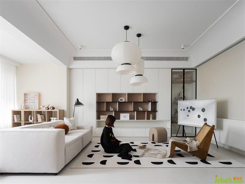 材質上以棉麻、藤編、木質、百葉為主,搭配少量的紙質、金屬。配色上則以奶茶裸色為基調,家裝設計加入原木色系的木質、柔軟的紗麻,加上少量的黑灰色點綴,整個空間舒適而治愈。