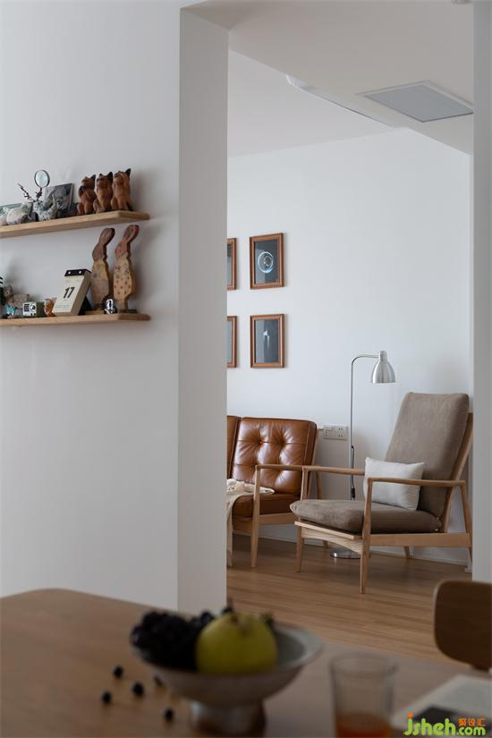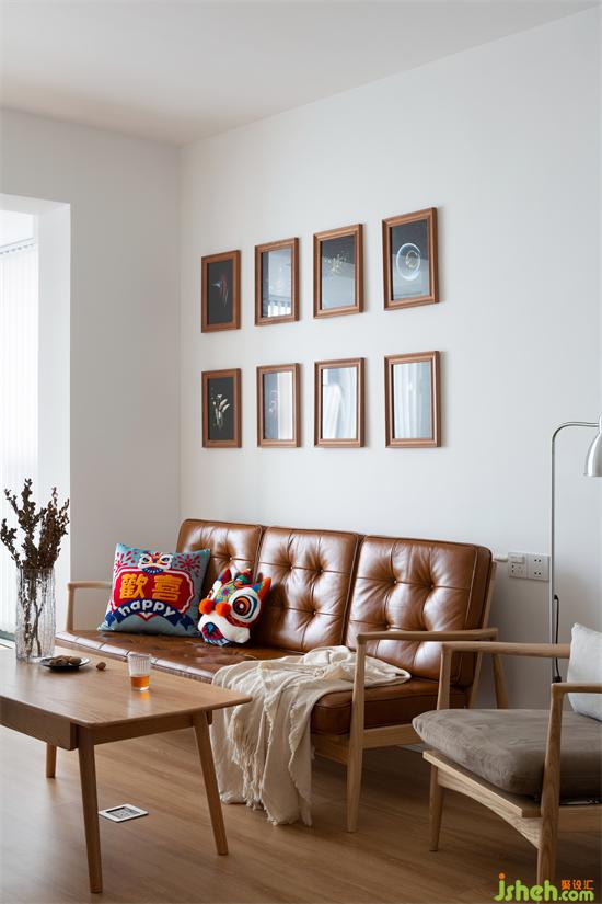 中午的時候,屋主習(xí)慣躺沙發(fā)上休息一會兒,抱枕墊在頭后,再搭一面薄毯,慢慢入睡。一字皮質(zhì)沙發(fā)+茶幾+電視組成起居室,小小的空間看電視、吃零食十分舒服。