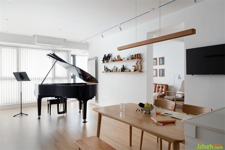 鋼琴的位置是經(jīng)過仔細(xì)考慮的,舊房改造四周留有寬敞的過道,方便通行和朋友聚會。有朋友留宿時,放下墨菲床即可,不受阻礙。
