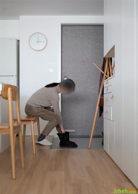 舊房改造入戶區(qū)域做了下沉區(qū),常穿鞋和包包帽子等放在此區(qū)域,首飾、墨鏡等則放在一旁的收納柜。