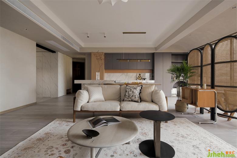 ?. 客廳+陽臺:將客廳和陽臺打通,中間以屏風(fēng)隱約阻隔。陽臺放置藤編休閑椅和貓砂盆、貓爬架,作為人和貓咪的休閑玩耍區(qū)域。